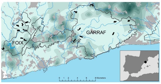 The study area includes two protected areas (Garraf and Foix Natural Parks) covering 15,000 ha in the Litoral Range of Barcelona province, NE Spain (Figure 1). The landscape has been modelled by human activities (forest management, cattle grazing, crops) for centuries, but those activities have been progressively abandoned during the last decades. Tree cover is composed of Aleppo pine (Pinus halepensis), which was negatively affected by fire recurrence, with two large wildfires burning 10,000 ha (1982) and 4300 ha (1994), compromising tree regeneration []. The natural vegetation consists of coastal maquis of Quercus coccifera and Chamaerops humilis and coastal holm oak Q. ilex forests, which are dominated by fire-adapted plant species (Q. coccifera, Q. ilex, Arbutus unedo, Pistacia lentiscus) and species with enhanced post-fire germination after fire (Pinus halepensis and Cistus spp.). Garraf’s land uses are dominated by shrublands and grasslands (80%), followed by woodlands (15%), small patches of crops (2%) and urban areas (3%). Shrublands and grasslands are also dominant in Foix (65%), but crops are the second ranked land-use (20%), followed by woodland (11%) and urban areas (4%) [].