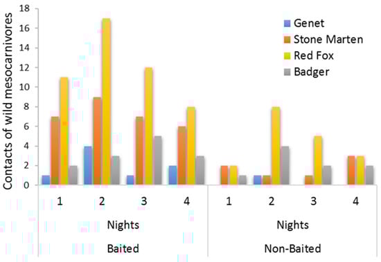 Frequency of occurrence (independent contacts) of wild mesocarnivores along the four nights of camera exposure in baited and non-baited stations.