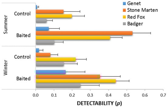Seasonal modelled probability of detection (detectability, p ± SE) of the four wild mesocarnivore species according to the use of bait in alternate positions in camera stations within the 16 line-transects of four cameras each.