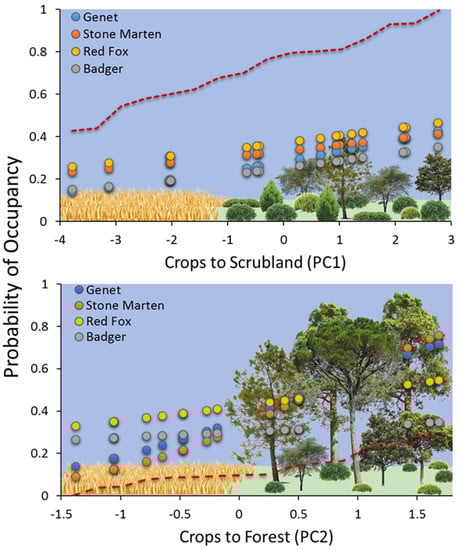 Thus, the use of bait efficiently controlled for the non-occurrence of false negatives during short surveys. Particularly, in the case of genets and stone martens (to a lesser extent) in non-baited stations, the number of consecutive surveys necessary to control for false absences by far outnumbered the sampling effort performed in this study (63 and 11 consecutive surveys, for genets and martens, respectively). The probability of the occupancy of wild species was affected by landscape composition gradients (represented by PCs, Table S1, Figure 4). Almost all species increased occupancy towards natural habitats (forests and scrublands), and this increase was especially relevant for genets and stone martens along the forest gradient. Both PCs were selected in six out of eight significant occupancy models, and those considered valid included bait as a factor affecting detectability.