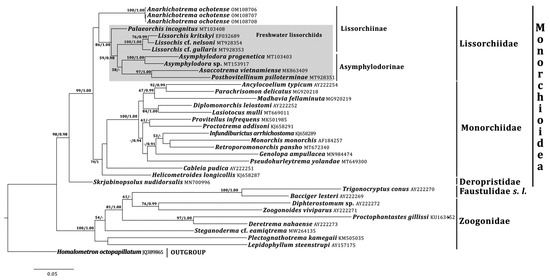 The results of our phylogenetic analysis allow us to hypothesise about the marine ancestor of the Lissorchiidae. This is evidenced by both the basal position of a taxon with a marine life history (Anarhichotrema) in the clade of lissorchiid trematodes and by the marine ecology of the main number of members of the Monorchiidae, that is a sister to this clade. However, verification of this hypothesis requires a phylogenetic assessment of the few known freshwater genera of monorchiids: Heckmannia Bilqees, Hadi, Khan & Perveen, 2012 and Sphericomonorchis Thatcher, 1996.