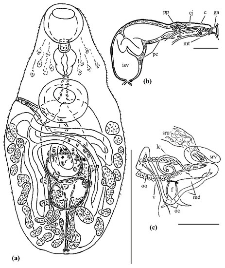 Anarhichotrema ochotense from intestine of Anarhichas orientalis, the Sea of Okhotsk: (a) whole mount, ventral view; (b), terminal genitalia, ventral view; (c), ovarian complex, dorsal view. Abbreviations: c, invaginated cirrus; ej, ejaculatory duct; f, fertilization chamber; ga, common genital atrium; isv, internal seminal vesicle; lc, Laurer’s canal; md, middle part of oviduct; mt, metraterm; oc, ovicapt; oo, oötype with Mehlis’ gland cells; pc, prostatic cells; pp, pars prostatica; src, canalicular seminal receptacle; sru, uterine seminal receptacle; v, vitelline reservoir. Scale bars: (a) = 500 µm, (b,c) = 50 µm.