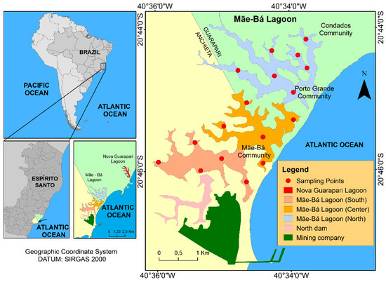 The entire area of the Mãe-Bá Lagoon (4.67 km2) can be divided into three regions: the southern region (1.38 km2), which is located close to the iron ore plant and connected to the northern dam from which industrial effluents are released; the central regions (1.51 km2), which is located relatively close to the iron ore plant and the Mãe-Bá community, which releases its sewage directly into the lagoon without proper treatment by the sewerage company despite the existence of a sewage collection system; and the northern region (1.78 km2), which is located across from a mining company and close to the local Porto Grande and Condados communities (Figure 1).