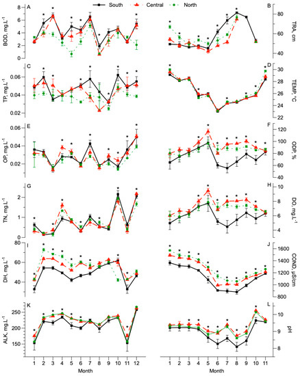 Physicochemical parameters of water in southern, central, and northern regions of Mãe-Bá Lagoon in (1) January, (2) February, (3) March, (4) April, (5) May, (6) June, (7) July, (8) August, (9) September, (10) October, (11) November, and (12) December. * Tukey’s test showed statistically significant differences between regions during each month (p < 0.1).