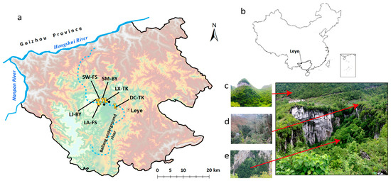 Map of the study area including the plot location. Sample sites in Dashiwei Tiankeng Group, Leye, China (a,b). Location of three habitats (c–e), the nearby non-Tiankeng forest (c), the fringe of Tiankeng forest (d), and the inside of Tiankeng forest (e). Maps are created with ArcMap 10.5. Data map source from the Ministry of natural resources, PRC (http://www.mnr.gov.cn/, figure number: GS(2016)1595, accessed on 23 November 2021), Geospatial data cloud, Chinese Academy of Sciences (http://www.gscloud.cn/, accessed on 23 November 2021).