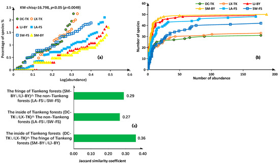 There was a significant difference in SADs patterns (Kruskal-Wallis chisq = 16.798, p < 0.05) between the Tiankeng and non-Tiankeng forests (Figure 2a). The species accumulation rate was highest in the fringe of Tiankeng forests and lowest in the inside of Tiankeng forests (Figure 2b). The Jaccard index showed that the species similarity between the fringe and inside of Tiankeng forests was the highest (0.36), followed by the non-Tiankeng forests, and the fringe of Tiankeng forests (0.29), and between the inside of Tiankeng forests and the non-Tiankeng forests was the lowest (0.27) (Figure 2c).