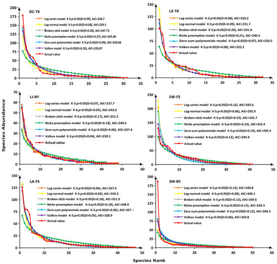 We performed K-S test based on 999 times bootstrap simulation to verify the fitting results between the observed and simulation values from six models. When the p < 0.05, this test indicates that the model has not passed the test, otherwise, the model is accepted [41]. The goodness-of-fit of the model was determined by the lowest AIC value. If the AIC value of a model is more than 2 (△AIC > 2) and lower than others, then this model is considered significantly better than other models [42]. These basic statistical analyses were conducted using the ‘sads’ and ‘Matching’ packages in R software 4.0.0. (R core team, Vienna, Austria) [36,42].