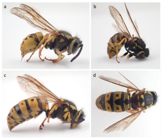 Representative specimens of Vespula germanica collected in South Africa: (a) Worker specimen 40 A, (b) Worker specimen 140 A, (c) Queen specimen 127 A lateral, and (d) dorsal view.
