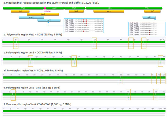 (a) Mitochondrial regions sequenced in this study and in Eloff et al. 2020 [9]. Blue boxes show the position of SNPs in COX2 and CytB reported in [9] but not found in this study. (b–e) Orange boxes highlight SNPs in the sequenced polymorphic regions. (f) Ves6 was monomorphic in this study, but Eloff et al. [9] reported SNPs therein. cox1*, cox2* and cytB*-regions sequenced in Eloff et al. [9].