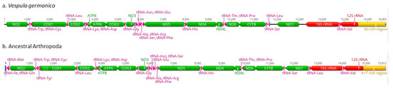 (a) Gene order and content of the partial mitochondrial genome of Vespula germanica and (b) the complete mitochondrial genome of the hypothetical Arthropoda ancestor.