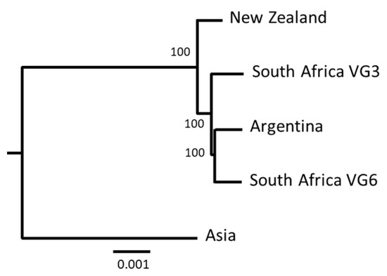 The phylogenetic reconstruction of the relationships among V. germanica using the currently available mitogenomes evidenced the divergence between the Asian sequence and the cluster formed by South Africa, New Zealand, and Argentina, with maximum nodal support (Figure 4). Although the data available for phylogenetic analyses were very limited, the tree indicated that V. germanica is phylogeographically structured between East (Asia) and West (Europe) and supported a European origin for the invasions in South Africa, New Zealand, and Argentina, as opposed to an Asian origin.