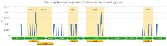 Polymorphic regions were identified in the alignment of four complete mitogenomes of Vespula germanica collected in South Africa, Argentina, and New Zealand. Vertical axis: Pi—nucleotide diversity. Horizontal axis: location of the 13 mitochondrial protein-coding genes (green) and selected polymorphic regions (orange) for Sanger sequencing.