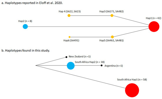 A total of 76 wasps from 72 nests were haplotyped, including 88% (36/41) of the nests sampled in Eloff et al. [9], and represent a much larger dataset and a higher coverage of the geographic distribution of V. germanica in South Africa compared to the previous study. Overall, the sequencing of a combination of selected mitochondrial regions showed two haplotypes, of which Hap1 was present at a higher frequency (0.76) than Hap2 (0.24) (Figure 2a; Table 2). This result disagrees with Eloff et al. [9], who also found Hap1 and Hap2 but reported four additional haplotypes at low frequency. The mitochondrial regions sequenced in Eloff et al. [9] were covered in our study, and the polymorphisms in COX2 and CytB that defined the low-frequency haplotypes in a total of seven wasps reported in the previous study (SA22, SA23, SA271, SA482, SA461, SA481, and SA491) were not found (Figure 2a), although wasps from the same nests were analyzed. Furthermore, most of the wasps with low-frequency haplotypes reported in Eloff et al. [9] were found in the same nest along with wasps with other haplotypes; SA271 (Hap3) and SA272 (Hap1) were from the same nest, as well as SA481 (Hap5) and SA482 (Hap3), and SA491 (Hap6) and SA492 (Hap1). This unexpected result was not mentioned by the authors. The SNPs that define the low-frequency haplotypes reported in Eloff et al. [9] are located in regions of the sequences that are prone to low quality nucleotide calling; some polymorphisms are adjacent to a homopolymeric T-stretch in COX2, and others at the end of the sequence in CytB (Figure 2a). The low-frequency haplotypes reported in Eloff et al. [9] are closely related to Hap1, and Hap1 and Hap2 appear separated by two mutational steps. The network of the haplotypes found in our study, including Argentina and New Zealand for context, showed a closer relationship between Hap2 and Argentina than between Hap2 and Hap1 (Figure 6).