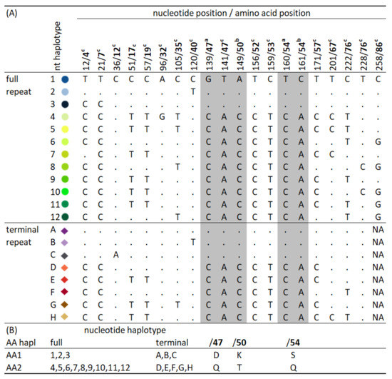 Multiple alignments within full (261 bp) and terminal (243 bp) repeats, respectively. (A) Haplotypes based on differences in nucleotide sequences and (B) amino acid haplotypes with corresponding AA changes. Non-synonymous substitutions are shown with grey background. Colour symbols are assigned to haplotypes to be used hereafter. a,b,c refer to the first, second and third codon positions, respectively.
