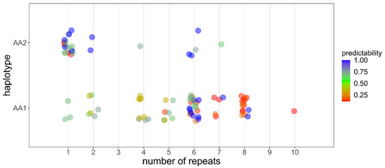 Relationship between the number of repeats in each sequenced allele (full and terminal together), amino acid haplotypes (AA1, AA2) and environmental predictability of the corresponding population.