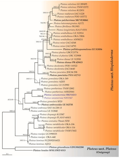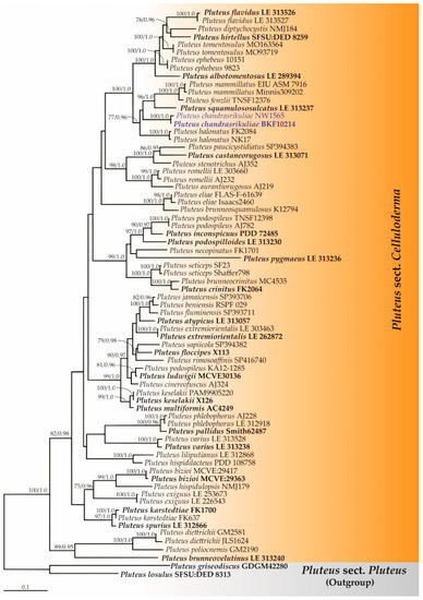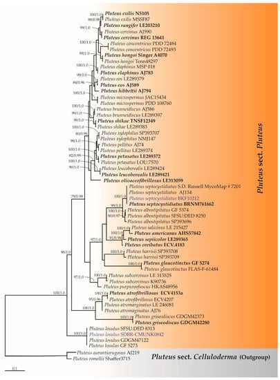 Phylogenetic analysis was carried out based on only the ITS sequences because the amount of available sequence data in the nrLSU gene is practically limited. Sequences from this study along with those obtained from previous studies and the GenBank database were selected and are provided in supplementary Table S1. Multiple sequence alignment was performed using MUSCLE [69]. The alignments of ITS sequences of Pluteus sect. Celluloderma, sect. Hispidoderma, and sect. Pluteus were deposited in TreeBASE under the study ID numbers 29242, 29243, and 29244, respectively. A phylogenetic tree was constructed under the maximum likelihood (ML) and Bayesian inference (BI) methods. The ML analysis was carried out using RAxML-HPC2 on XSEDE (8.2.10) in CIPRES Science Gateway V. 3.3 [70] using the GTRCAT model with 25 categories and 1000 bootstrap (BS) replications. The optimum nucleotide substitution model was obtained using jModeltest v.2.3 [71] under the Akaike information criterion (AIC) method. The BI analysis was performed using MrBayes 3.2.6 software for Microsoft Windows [72] with the selected optimal model being the GTR + I+G model. Bayesian posterior probabilities (PPs) were obtained from the 50% majority rule consensus of the trees kept. The tree topologies were visualized in FigTree v1.4.0 [73].