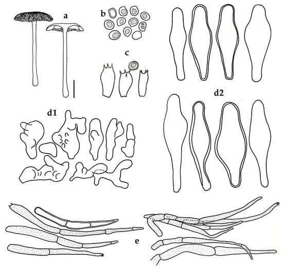 Pluteus chandrasrikuliae BKF 10214 (holotype): (a) basidiomes; (b) basidiospores; (c) basidia; hymenial cystidia: (d1) irregular shaped cystidia; (d2) lageniform cystidia; (e) pileipellis element. Scale bars: (a) = 20 mm; (b,c) = 10 μm; (e) = 25 μm.