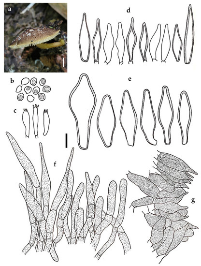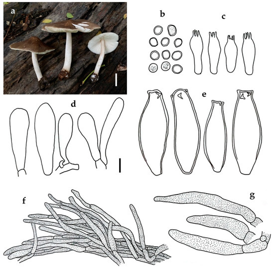 Pluteus saisamorniae BKF 10213 (holotype): (a) habit; (b) basidiospores; (c) basidia; (d) cheilocystidia; (e) pleurocystidia; (f) pileipellis element; (g) caulocystidia. Scale bars: (a) = 5 mm; (b–g) = 10 μm.