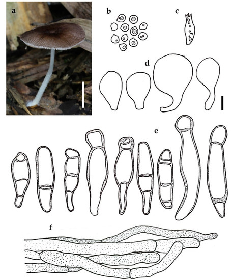 Pluteus setocystidiatus BKF 10212: (a) habit; (b) basidiospores; (c) basidium; (d) cheilocystidia; (e) pleurocystidia; (f) pileipellis element. Scale bars: (a) = 10 mm; (b–f) = 10 μm.