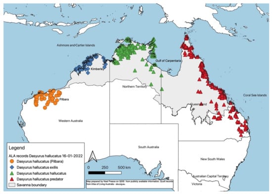 Records of northern quolls Dasyurus hallucatus from the Atlas of Living Australia (ALA) (https://www.ala.org.au/ (accessed on 16 January 2022)). Note the large gaps in distribution across the southern Gulf of Carpentaria and the northern and western distributions, and the minor gap between the Northern Territory (D. h. hallucatus) and Western Australian (D. h. exilis) subspecies.