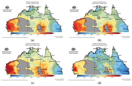 Northern rainfall onset medians showing differences in timing and trends of seasons: (a) All years median onset, (b) Neutral years median onset, (c) El Niño years median onset, and (d) La Niña year median onset [130] (accessed on 10 December 2021).
