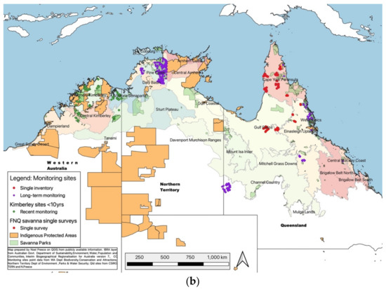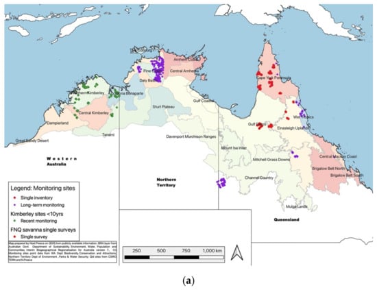 Only three of the bioregions have adequate (or any) long-term monitoring of biodiversity, all in the NT and all in National Parks or Indigenous lands (Darwin Coastal, Pine Creek, Arnhem Plateau) [249] (Figure 3). Queensland savannas have no long-term biodiversity monitoring sites. A set of sites in the Desert Uplands bioregion in central Queensland was established in 2004 and research was conducted until about 2012, but the Long-Term Ecological Research Network (https://www.ltern.org.au/ (accessed on 29 April 2021)) that supported the studies was defunded in 2018, after less than six years of operation.