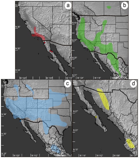 - Riddle, B.R.; Hafner, D.J.; Alexander, L.F.; Jaeger, J.R. Cryptic Vicariance in the Historical Assembly of a Baja California Peninsular Desert Biota. Proc. Natl. Acad. Sci. USA 2000, 97, 14438–14443. [Google Scholar] [CrossRef] [PubMed] [Green Version]