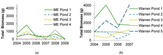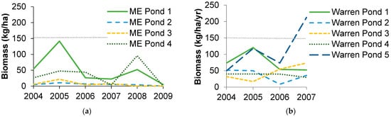Amphibian wet biomass export per wetland area for (a) four ponds in Penobscot County, Maine (ME) over six years and (b) five ponds in Warren County, Missouri (DBCA) over four years. Gray line represents amphibian biomass export from a Carolina bay in South Carolina [15].