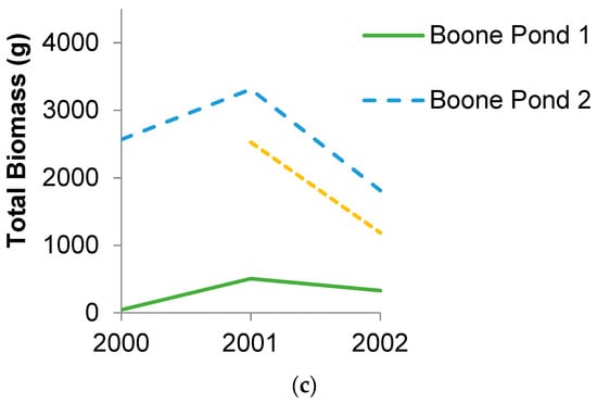 Total amphibian wet biomass export for (a) four ponds in Penobscot County, Maine (ME) over six years, (b) five ponds in Warren County, Missouri (DBCA) over four years, and (c) three ponds in Boone County, Missouri over two to three years (ponds 1 and 2: Baskett Wildlife Area, edge pond: Mark Twain National Forest).