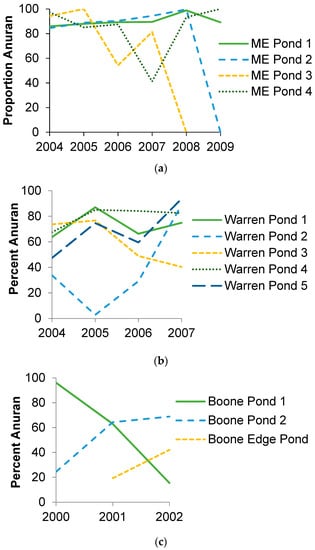 Percent of amphibian biomass export coming from anurans for (a) four ponds in Penobscot County, Maine (ME) over six years, (b) five ponds in Warren County, Missouri (DBCA) over four years, and (c) three ponds in Boone County, Missouri over two to three years (ponds 1 and 2: Baskett Wildlife Area, edge pond: Mark Twain National Forest).