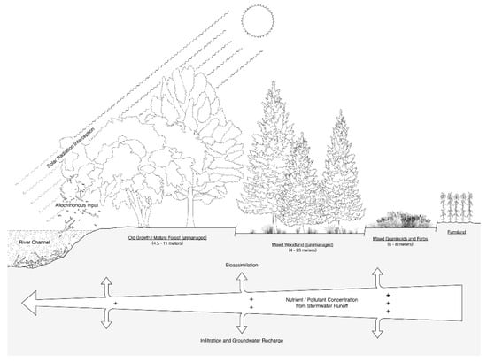 Riparian zones are influenced by hydrodynamic forces in fluvial ecosystems (i.e., lotic systems, such as rivers and streams) and represent transitional aquatic-terrestrial interphase bordering these ecosystems, and as such have numerous functions. They connect terrestrial and aquatic habitats through surface runoff, subsurface flow, and flooding [1,2,3]. Riparian zones are characterized by saturated soils, elevated water tables, and a three-dimensional configuration, which extends laterally into the river basin, vertically into the riparian canopy and groundwater, and longitudinally along fluvial channels [1,2,3,4]. Through surface and subsurface hydrologic processes, riparian buffers colligate waterbodies with adjacent uplands and govern the exchange of energy and matter between aquatic and terrestrial ecosystems [3,5]. The three-dimensional configuration, mediation of energy and matter flow, habitat heterogeneity, and the unique biotic communities make riparian zones an integral constituent of riverscapes [6,7]. The constituents and conceptual framework of riverscapes vary considerably among various disciplines of applied and foundational ecology. Lotic systems and their biota, including the spatiotemporal dynamics (e.g., species-habitat and community-scale interactions) inherent to these systems, nested within socioecological landscapes are collectively referred to as a riverscape [8,9]. While accommodating this broader viewpoint, riverscapes can be defined as spatially structured, hierarchically organized, heterogeneous habitat mosaics nested within the river continuum [10,11,12,13,14].