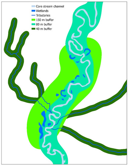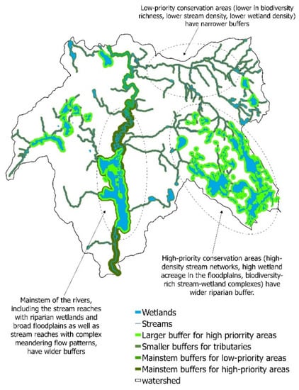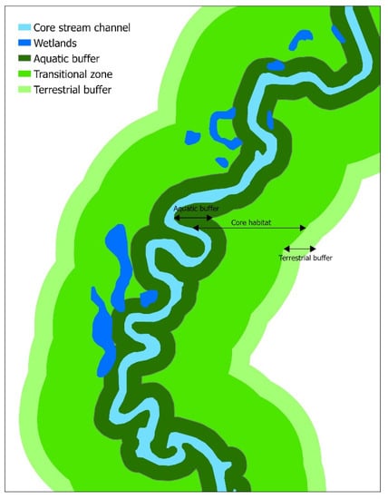 The magnitude, spatiotemporal extent, and importance of ecological functions of riparian zones depend on both large-scale watershed-wide regional properties and small-scale local habitat characteristics [96]. Thus, the delineation of riparian buffers should be a synergistic product of both local and watershed-scale factors.