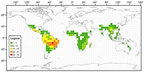 Extant distribution of Bauhinia. Different colors in the map indicate the number of species in each grid square. Extant occurrence data of Bauhinia are from the Global Biodiversity Information Facility (GBIF).