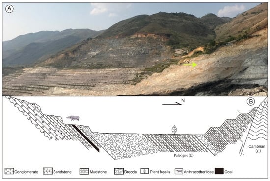 Cross section of the fossil locality in Puyang Basin, southeastern Yunnan Province, China. (A) The fossiliferous outcrop. The light green arrow indicates the layers where our fossils were collected. (B) Cross section of the fossil locality.