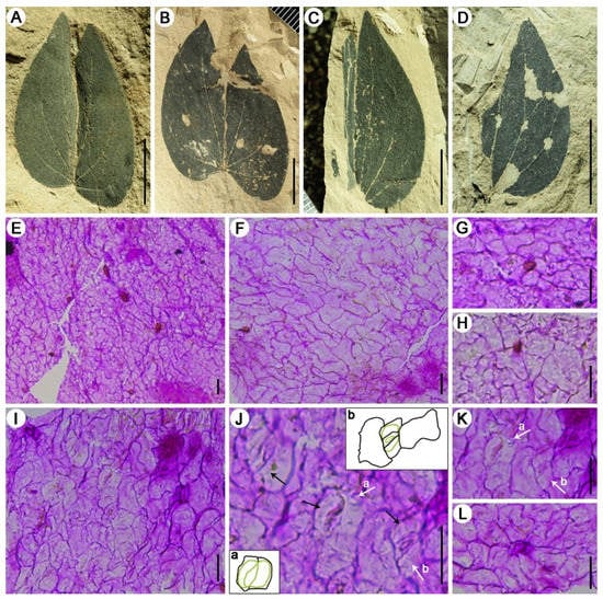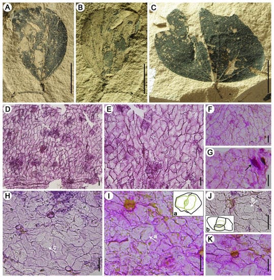 Fossil leaf fragments were treated with HCl and HF to remove calcareous and siliceous materials, and then macerated using 3% NaClO solution for 30 min to one hour until they became translucent [27,28,29]. For extant materials, fragments from mature leaves were macerated using a 1:1 solution of CH3COOH and 30% H2O2 at 80 °C for about one hour [30,31]. After the mesophyll tissue was removed, the adaxial and abaxial cuticles for both fossil and extant materials were stained for about 30 min using Safranin O, mounted in glycerine on glass slides, and then photographed using a light microscope (Leica DM 750 with a Leica DFC 295 camera). All cuticular slides are stored at Kunming Institute of Botany, Chinese Academy of Sciences.