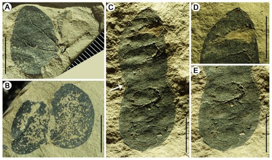 Leaf morphologies of Bauhinia sp. (morphotype 3) and fruit morphology of cf. Bauhinia sp. (morphotype 4). The scale bars represent 1 cm. (A) FN0189; (B) FN0616; (C–E) FN0465.