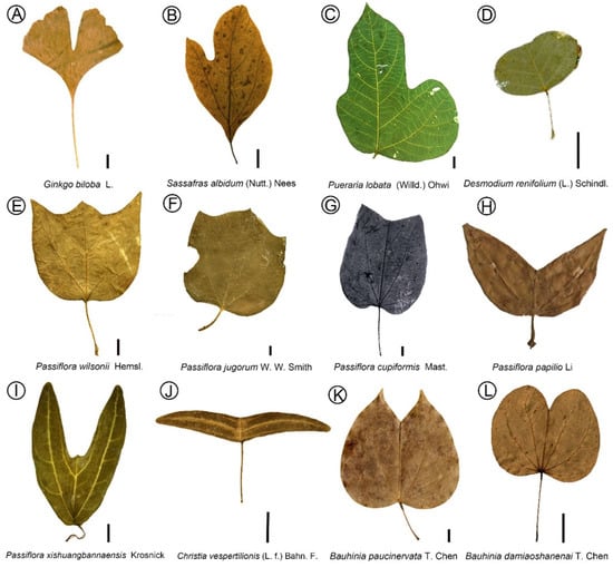 Leaf morphologies of bilobed or bilobe-like leaves in Ginkgoaceae Engl. (A) Lauraceae Juss. (B), Passifloraceae Juss. ex Roussel (E–I), and Leguminosae Juss. (C,D,J–L). The scale bars represent 1 cm.