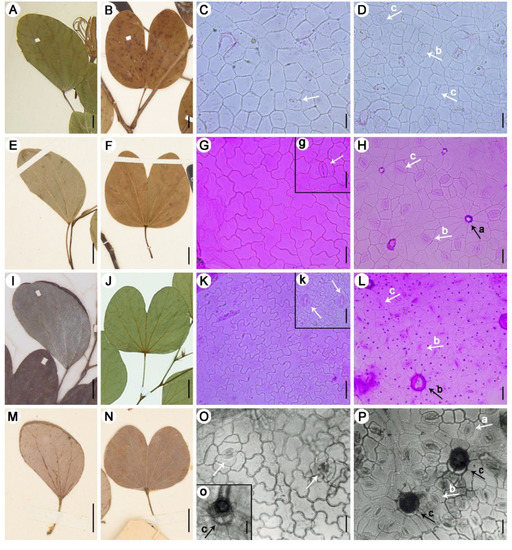 Leaf morphologies, together with adaxial (C,G,K,O) and abaxial (D,H,L,P) epidermises of Bauhinia purpurea L. (A–D) ((A) PE, 00327078; (B) KUN, 0125154), B. viridescens Desv. (E–H) (KUN 0169829), B. tomentosa L. (I–L) ((I) SYS, 00044882; (J) HITBC, 0021440), and B. racemosa Lam. (M–P) (KUN, 0125165). The scale bars represent 1 cm for leaf specimens and 20 μm for epidermal images. The image g in (G) indicates a stomatal complex of an adaxial epidermis. The image k in (K) indicates stomata of an adaxial epidermis. The image o in (O) indicates a trichome base of an adaxial epidermis. White arrows in (C), g, k, and (O) indicate stomata of adaxial epidermises; white arrows in (D,H,L,P) indicate (a) paracytic stomatal complex, (b) tetracytic stomatal complexes, and (c) sunken guard cells; black arrows indicate (a) a single-celled trichome base, (b) a single-celled glandular trichome base, and (c) multicellular trichome bases.