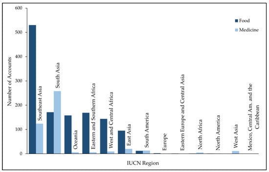 Comparison of bat usage for food (dark blue, n = 1284) and medicine (light blue, n = 453) measured as unique accounts of locations reported in the literature (1974–2021) and social media (September 2007–October 2021). Regions and subregions follow the IUCN classification system.