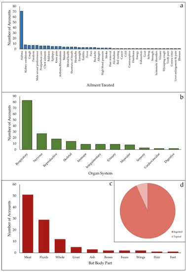There were 108 records that reported the specific organs or body parts of bats used in medicine, and 104 records indicated how the bat treatment was administered (Figure 2c,d). We found 10 specific organs or bat body parts were used, and bats were only administered through ingestion and topical application. Bat meat was the most common body part administered followed by bodily fluids, such as blood, oil, and bile.