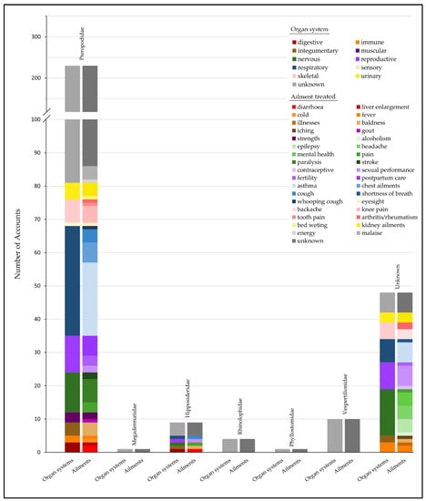 Medicinal use of bats by family. Human organ systems (left bar) aligned with the specific ailments that comprise them (right bar, n = 303). Data measured as unique accounts reported in the literature (1974–2021).