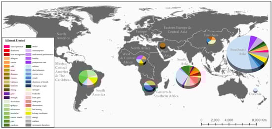 Global variation in type and quantity of ailments treated with bats (n = 188), measured as unique accounts reported in the literature (1974–2021). Size of pie charts reflect the number of data points in that region. Regions and subregions follow the IUCN classification system.