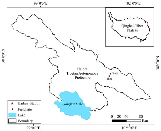 The study was conducted at Ganchaitan, which is a site close to the Haibei station (101°19′ E, 37°37′ N, 3240 m) in the northeastern QTP, located in Qinghai Province, China (Figure 1), from June 2017 to November 2020. This site has a plateau continental monsoon climate. The mean annual precipitation is approximately 562 mm, of which almost 80% falls during the growing season (May to September) [28]. The mean annual air temperature is approximately −1.7 °C, with the maximum in July (9.8 °C) and the minimum in January (−14.80 °C) [29]. The soil type in the study area was classified as Mollic Gryic Cambisols according to Soil Taxonomy [30], with abundant soil organic matter (SOM) in the surface layer. The thickness of the aquifer is approximately 50–70 m, and the shallow groundwater depth is 2.56 m [20]. Rodent infestation has been recognized as the main cause of shrub degradation at this site [20]. We used Potentilla fruticosa shrub coverage and the number of species as indicators of degradation. The aboveground biomass, belowground biomass, and other basic information of the study site are shown in Table 1. The soil characteristics are shown in Table 2 [31].