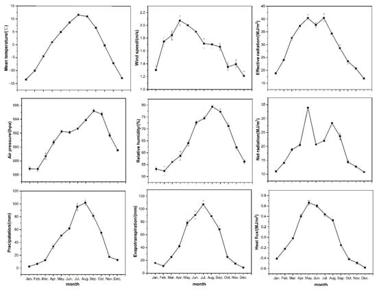 All meteorological factors exhibited seasonal changes (Figure 2); the daily mean temperature raised gradually from January to July and reached the maximum value in July, which was 11.18 °C, and showed a downward trend from August to December. The evapotranspiration had a similar trend with the temperature change, with a maximum value of 107.18 ± 5.62 mm in July. The precipitation and relative humidity increased gradually from January to August and May, reached their maximum in August, which was 101.87 ± 4.46 mm and 85 ± 1%, respectively, and decreased from August to December. The effective radiation, net radiation, and heat flux reached the maximum in May. The wind speed and air pressure reached the maximum in April and September. However, the rainfall was mainly concentrated in the growing season (80%), and the precipitation was lower in the non-growing season. The difference of evapotranspiration and precipitation was −29.86 to 4.63, evapotranspiration was greater than precipitation except for August, September, and October, on a monthly scale. The total evapotranspiration and precipitation value was 576.97 ± 5.83 mm and 531.9 1 ± 4.47 mm on an annual scale during 2017 to 2020.