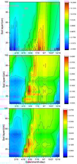 The temperature and soil water content of each soil layer varied greatly throughout the year according to the data from 2017 to 2020 (Figure 3). The temperature of each soil layer in both non-degraded and degraded shrub had the same trend: the shallow soil temperature (0−60 cm) fluctuated greatly, while the deep soil temperature (60−100 cm) fluctuated slightly for the shallow soil temperature, which was significantly affected by air temperature (Figure 3a). The change in soil water content of non-degraded shrub (Figure 3b) and degraded shrub (Figure 3c) was roughly the same as that of temperature. In the growing season, the change in soil water content in the shallow layer (0−60 cm) fluctuated greatly, while that in the deep layer (60−100 cm) fluctuated slightly because the precipitation from May to September was more abundant than that in the non-growing season, and 70% occurred from July to September. In the non-growing season, the soil water content in each layer decreased compared with the growing season, and the surface soil water content was the lowest, which was mainly caused by the gradually increasing freezing depth. The soil frost began to melt on mid-March, completely melted in early May, and a new round of permafrost began until early November; the soil water content increased significantly when the soil frost completely melted. This is consistent with the theory that freezing is one-way freezing and thawing is two-way thawing [23].
