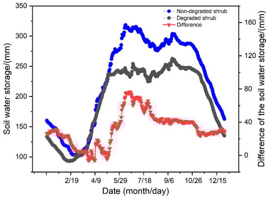Variation of soil water storage of degraded and non-degraded shrub during the year.
