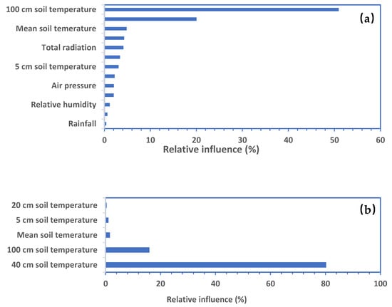 The driving factors of soil water storage were different during the growing and non-growing seasons. Thus, we analyzed the relationships between driving factors and soil water storage during the frozen and growing seasons separately. During the growing season (Figure 5a), the BRT results show that the 100 cm soil temperature was the most important factor affecting the seasonal variation in soil water storage, accounting for 51% of the total variation. This was followed by the 40 cm soil temperature (20%), mean soil temperature (5%), 20 cm soil temperature (4%), total radiation (4%), mean air temperature (3%), 5 cm soil temperature (3%), total reflected radiation (2%), air pressure (2%), wind speed (2%), and relative humidity (1%). Meanwhile, net radiation and rainfall had little impact on the seasonal variation in soil water storage. During the non-growing season (Figure 5b), the 40 cm soil temperature was the most important factor affecting the variation in soil water storage, accounting for 80% of total variation, followed by soil temperature at 100 cm (16%), mean soil temperature (2%), soil temperature at 5 cm (1%), and soil temperature at 20 cm (1%).