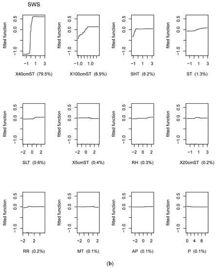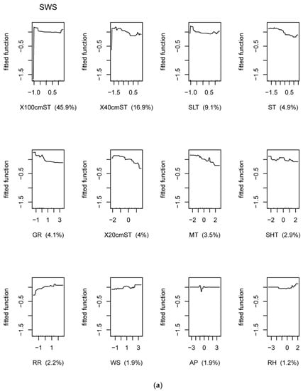 Because stronger collinearities and nonlinearities were observed among meteorological variables, it is inappropriate to examine the results based solely on the coefficient value of independent variables in multiple regression analysis. Consequently, a boosted regression tree (BRT) model was adopted to quantitatively evaluate the relative influence of environmental variables on soil water storage, without any transformations. The BRT approach has often been applied to improve the performance of a single model by fitting a large number of models, which are then combined to yield an overall prediction. The BRT model only uses two algorithms [32]. First, regression trees are obtained from the regression and classification groups of individual models. Second, the collection of models is then combined to yield the boosted regression tree. In addition, BRT incorporates the important advantages of tree-based methods and can deal with different types of predictor variables, irrespective of whether the variables are normally distributed. Furthermore, neither transformations nor outlier elimination are required, and the method can cope well with nonlinear relationships [33]. Therefore, BRT was applied to assess the individual influences of controlling factors on the variations in soil water storage, without gap-filling, and then each of the variables’ contributions to dependent factors was demonstrated using the BRT results.