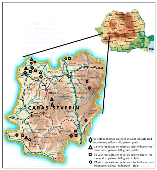 The research for this study was conducted at 24 harvesting sites in southwestern Romania in forests located in the plains, mountains and hill areas. The distribution of research variants was realized by taking into account the harvesting sites, depending on silvicultural work, for variants and, within them, depending on the relief by repeating the observations twice at harvesting sites from each relief form.
