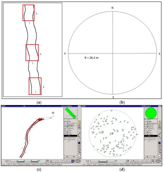 Location of sample plots: (a) along skid trails (schematic view); (b) inside the harvesting site (schematic view); (c) FieldMap representation of a sample plot from the skid trail; (d) FieldMap representation of a surface from inside the harvesting site.